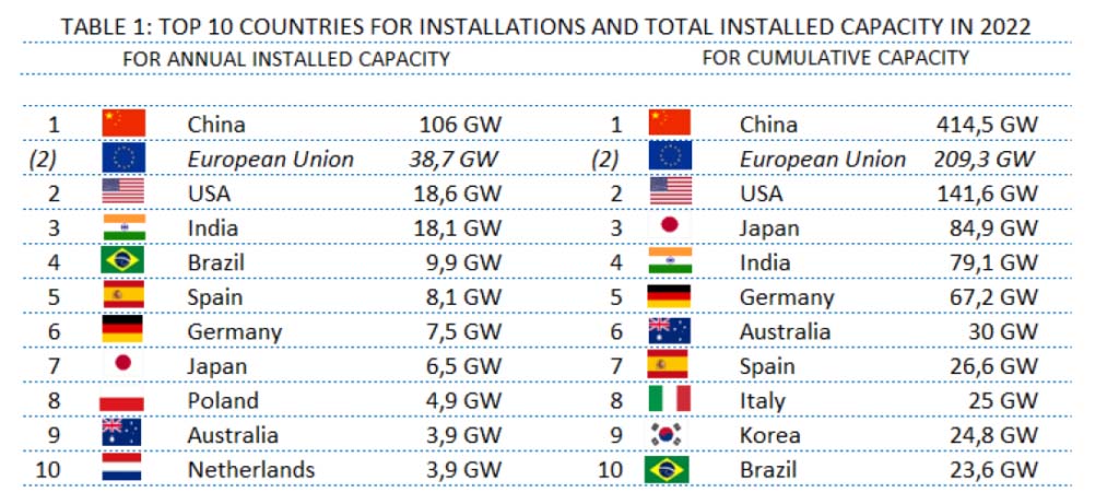 欧州連合 (EU) は昨年、38.7GW の太陽光発電容量を設置し、2021 年に登録された 27GW、2020 年に登録された 20GW から増加しました。スペイン (8.1GW)、ドイツ (7.5GW)、ポーランド (4.9GW)、オランダ ( 3.9GW)、EU は 209.3GW の累積容量で 2 番目に大きな市場でした。